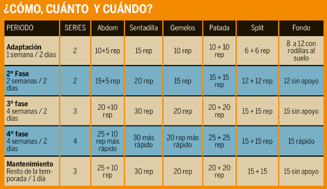 Si en este período no sigues la planificación de un entrenador personal que adecúe bien cada momento, nuestro consejo es que a medida que vayas dominado estas sesiones, en lugar de aumentar la carga con más peso, aumentes el número de repeticiones, de series y la velocidad, sin contaminar el gesto. Por ejemplo, con la sentadilla, las dos primeras sesiones son de adaptación, no más de 15 repeticiones a velocidad muy controlada, pero ya la tercera semana tendrás que llegar a 20 a mayor ritmo, para a partir de la cuarta llegar a las 30 con facilidad.