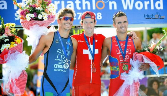 El suizo Reiderer, en el centro, flanqueado en el podio por el italiano Alessandro Fabian y David Castro