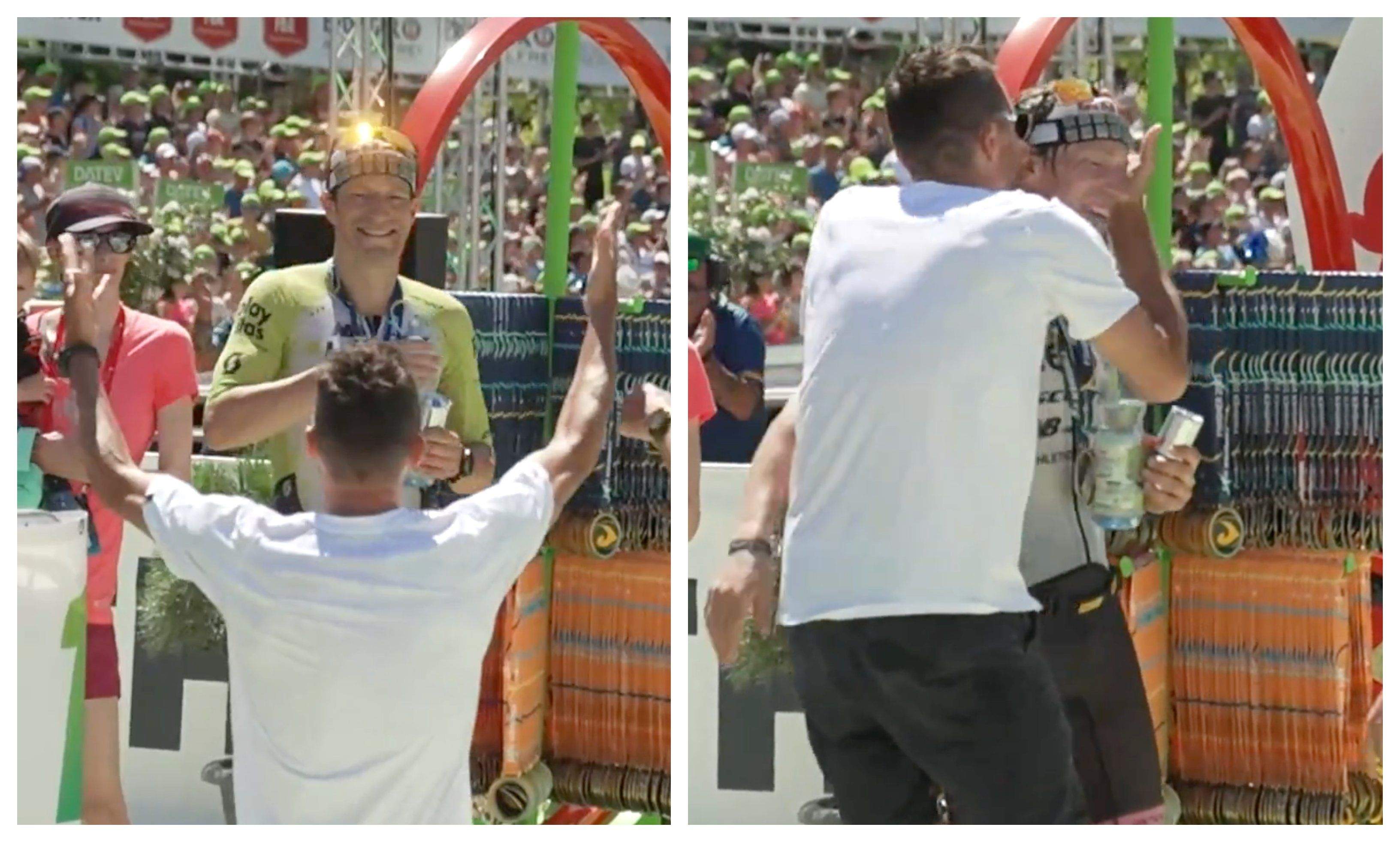'Frodo', a punto de cumplir 42 años, tan carismático como siempre, se arrodilló ante Kienle, otra leyenda del triatlón al que se ha enfrentado en infinidad de ocasiones en los últimos años. Luego le besó y le abrazó, al igual que Lange.